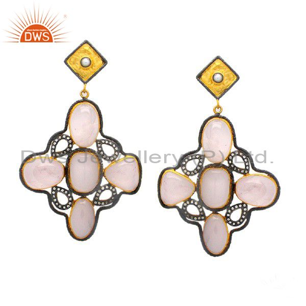 22K Yellow Gold Plated Sterling Silver Rose Quartz And Cz Dangle Earrings