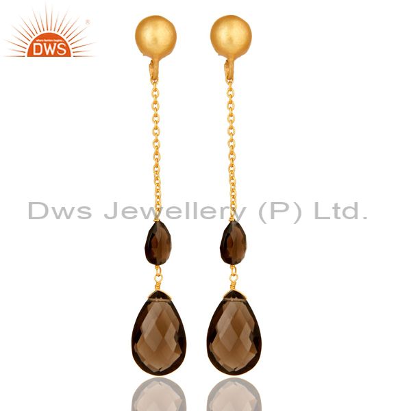 22K Yellow Gold Plated Sterling Silver Smoky Quartz Briolette Chain Drop Earring
