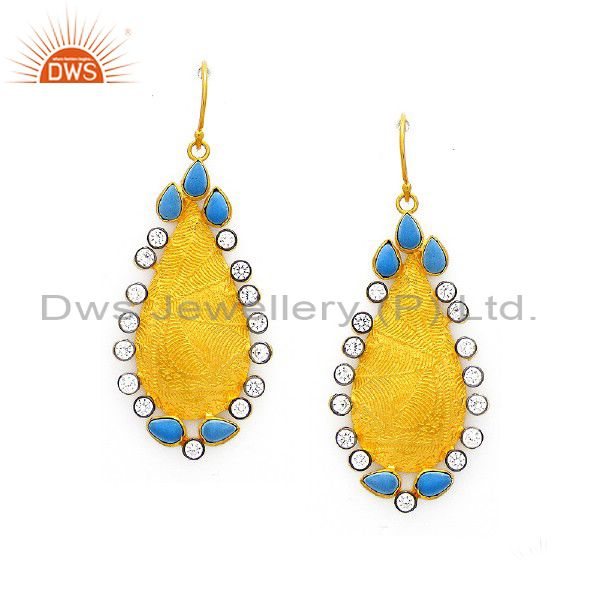 22K Yellow Gold Plated Sterling Silver Turquoise And Cz Dangle Earrings