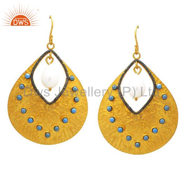 22K Yellow Gold Plated Sterling Silver Turquoise And Pearl Teardrop Earrings