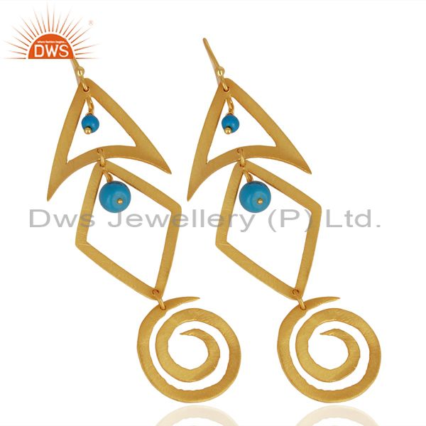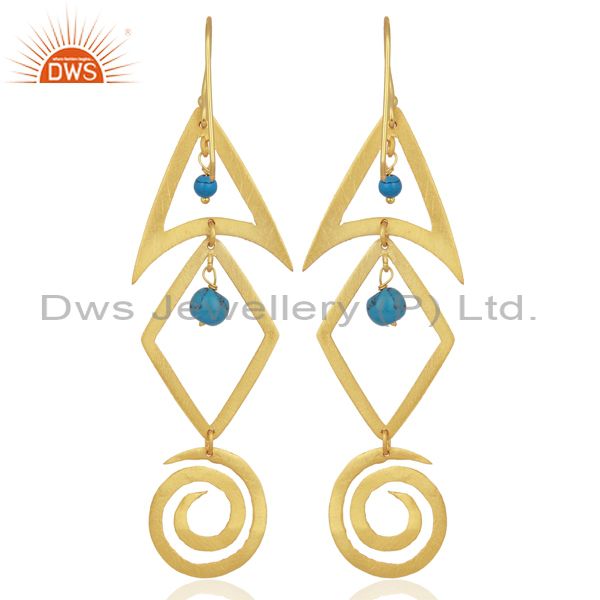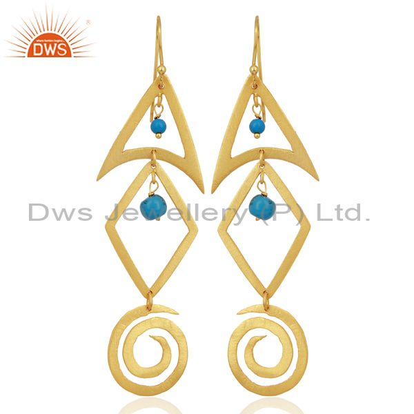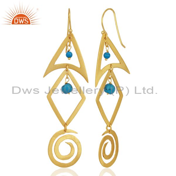22K Yellow Gold Plated Sterling Silver Turquoise Brushed Finish Dangle Earrings