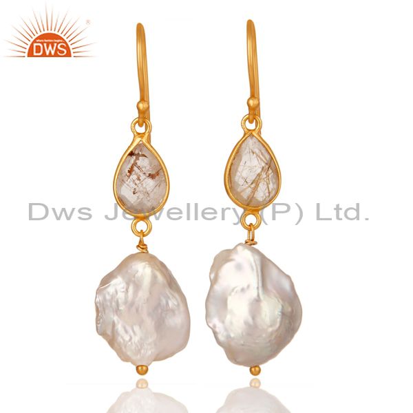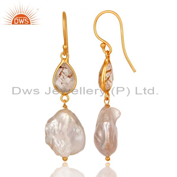 22K Yellow Gold Plated Sterling Silver Yellow Rutile And Pearl Drop Earrings