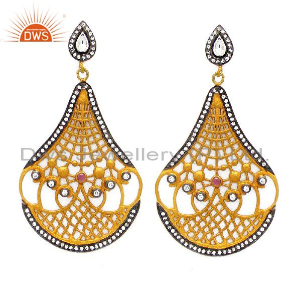 24K Gold Plated Sterling Silver Tourmaline And Cz Polki Designer Dangle Earrings