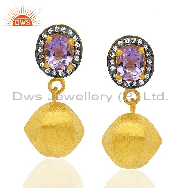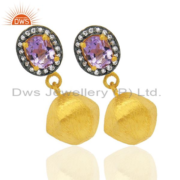 24K Yellow Gold Plated Brass Amethyst And Cz Fashion Teardrop Earrings