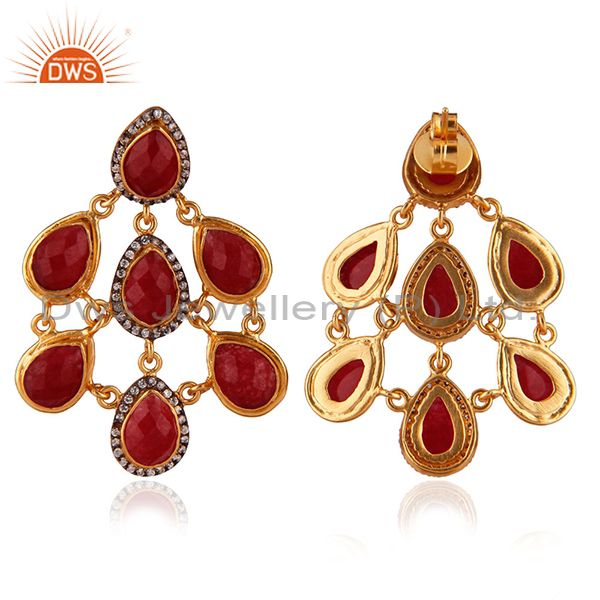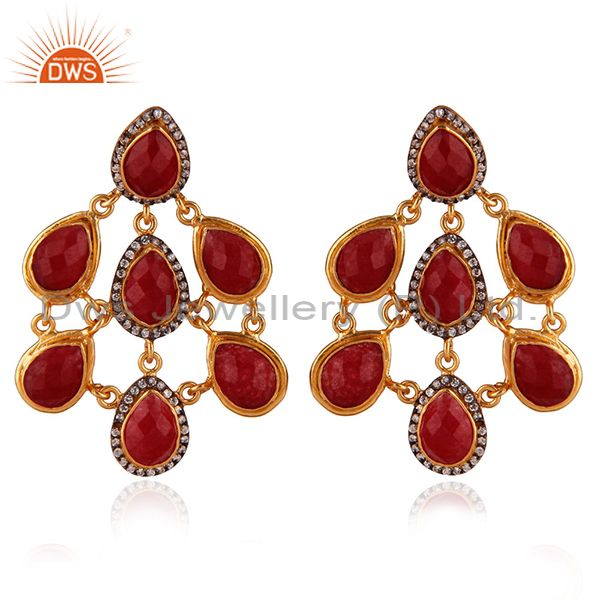 24K Yellow Gold Plated Brass Red Aventurine And Cz Womens Chandelier Earrings