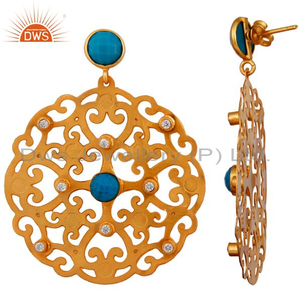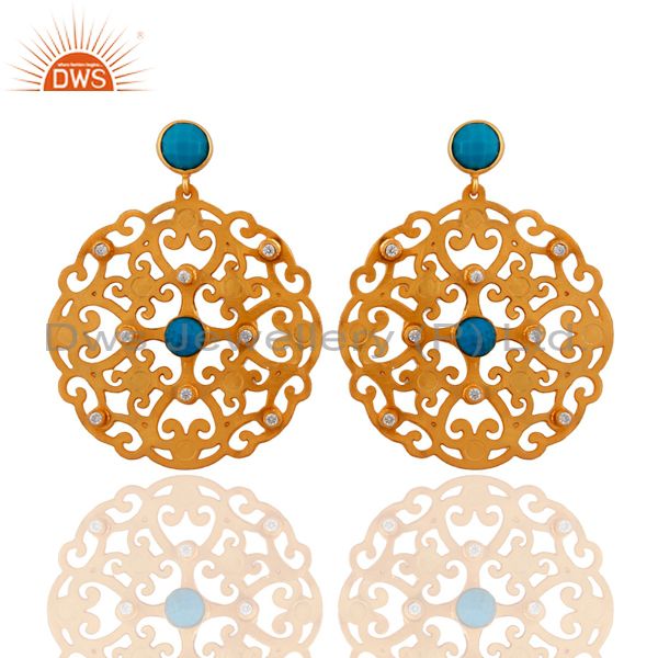 24K Yellow Gold Plated Brass Turquoise And Cz Filigree Disc Design Drop Earrings