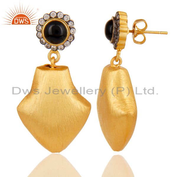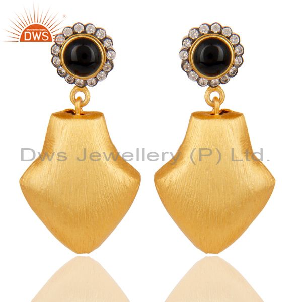 24K Yellow Gold Plated Dangle Brass Earrings With White Zirconia & Black Onyx
