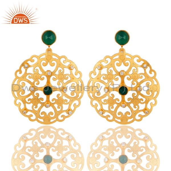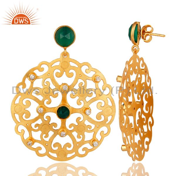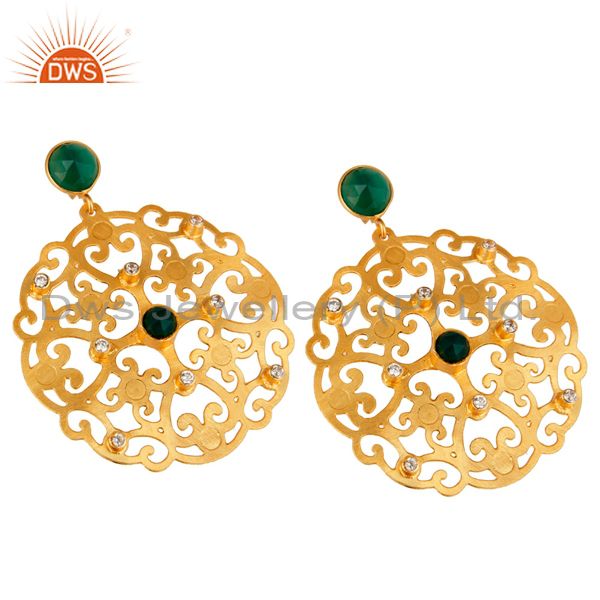 24K Yellow Gold Plated Green Onyx Filigree Disc Designer Earrings With Cz