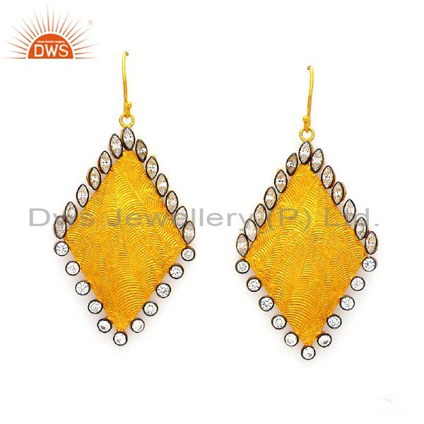 24K Yellow Gold Plated Sterling Silver Cubic Zirconia Textured Designer Earrings