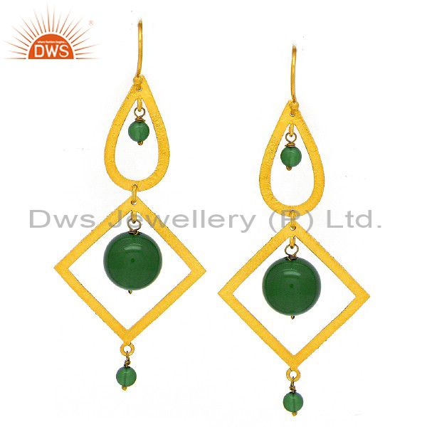 24K Yellow Gold Plated Sterling Silver Green Onyx Heart Designer Dangle Earrings
