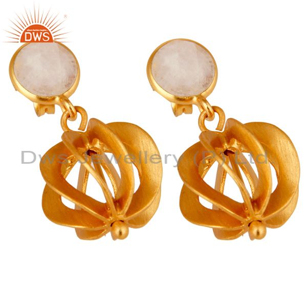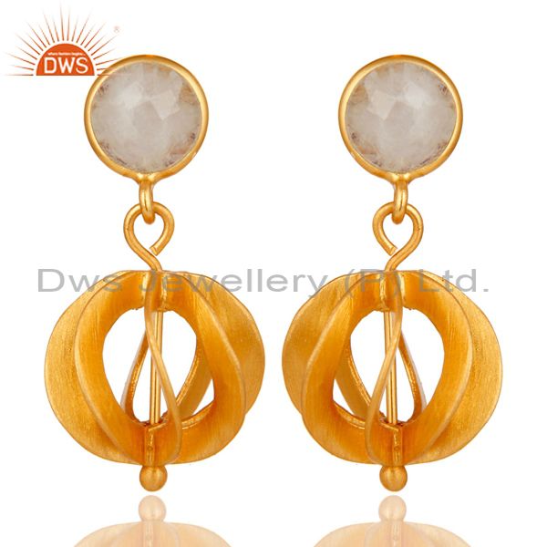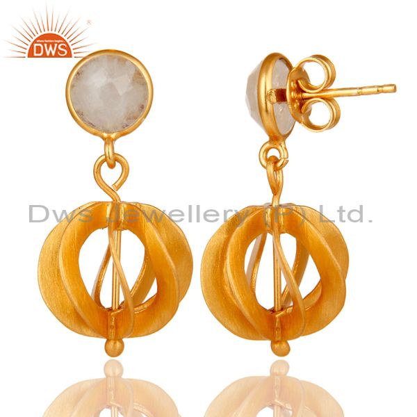 24K Yellow Gold Plated Sterling Silver Rainbow Moonstone Designer Dangle Earring