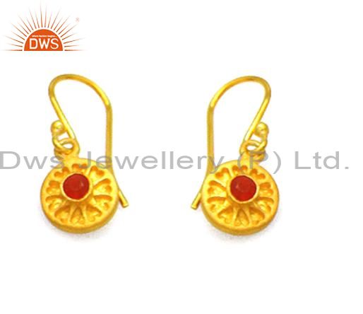 24K Yellow Gold Plated Sterling Silver Red Onyx Gemstone Dangle Earrings