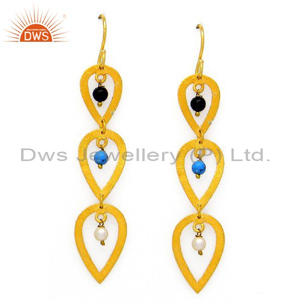 24K Yellow Gold Plated Sterling Silver Turquoise And Pearl Teardrop Earrings