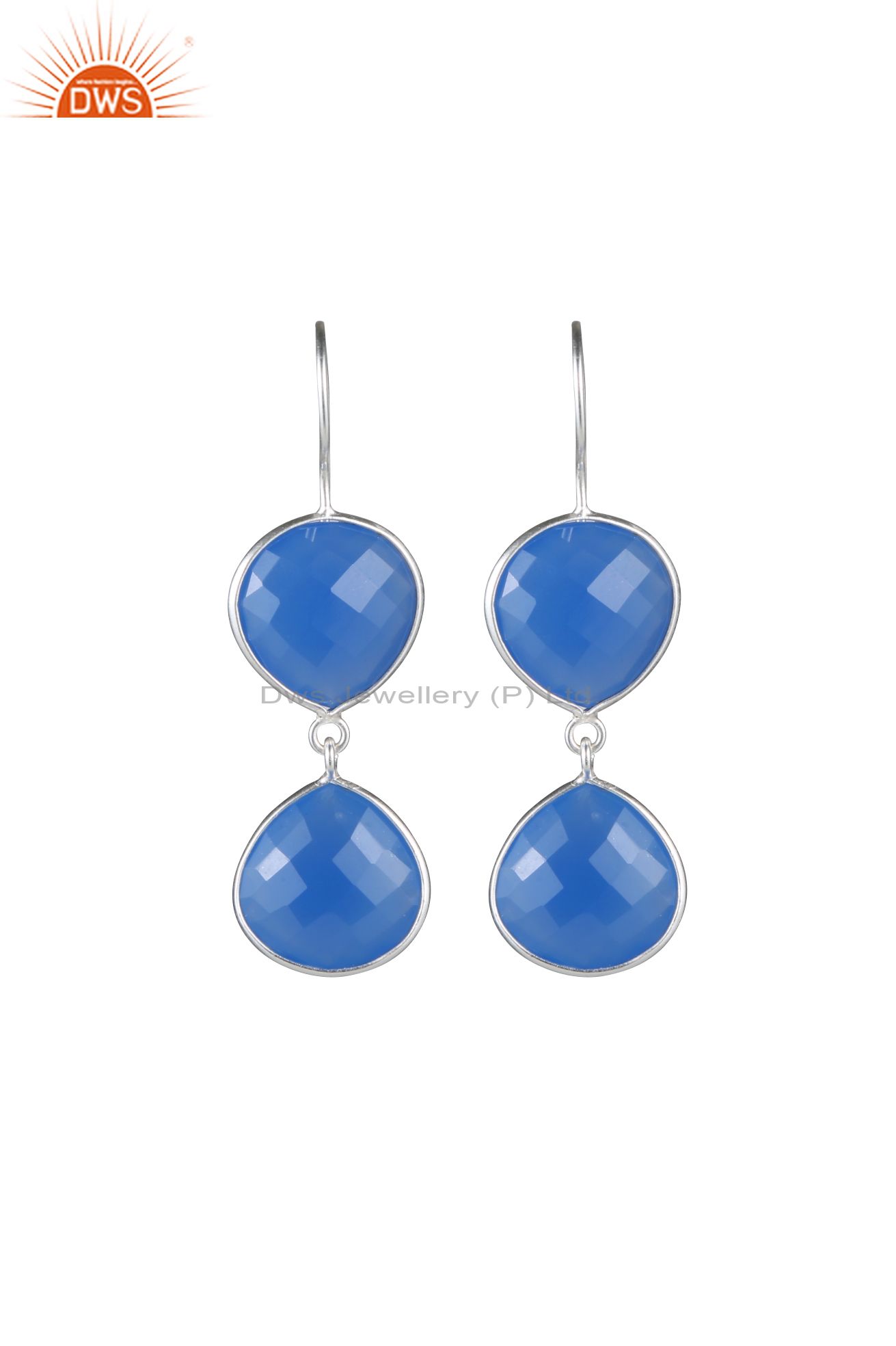 925 Sterling Silver Blue Chalcedony Faceted Gemstone Bezel Drop Earrings