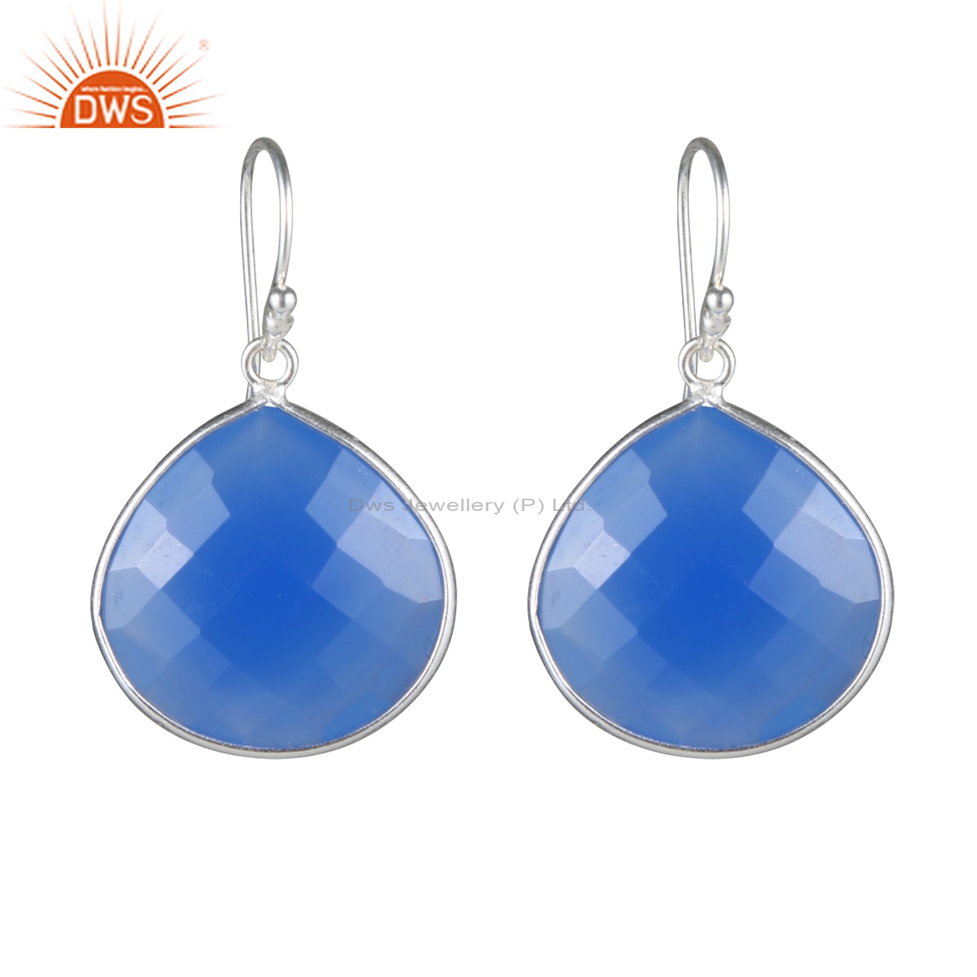 925 Sterling Silver Blue Chalcedony Faceted Gemstone Bezel Set Drop Earrings