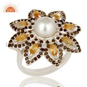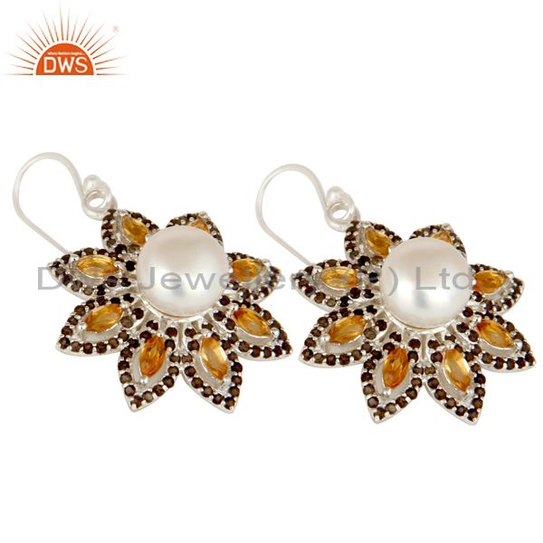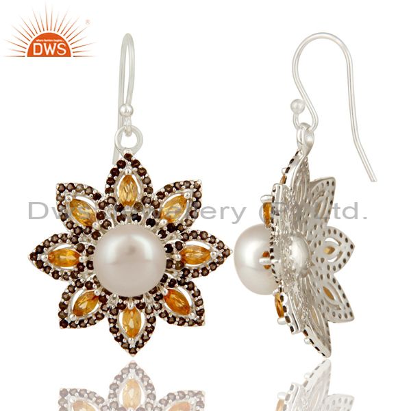 925 Sterling Silver Citrine Smokey And Pearl Flower Designer Dangle Earrings