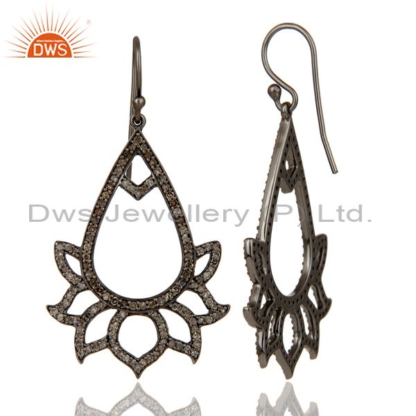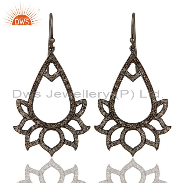 925 Sterling Silver Oxidized Handmade Pave Diamond Lotus Design Earrings Jewelry