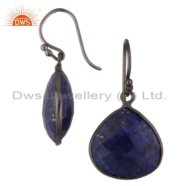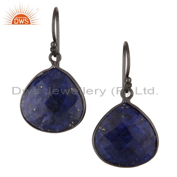 925 Sterling Silver Oxidized Lapis Lazuli Gemstone Bezel Set Drop Earrings