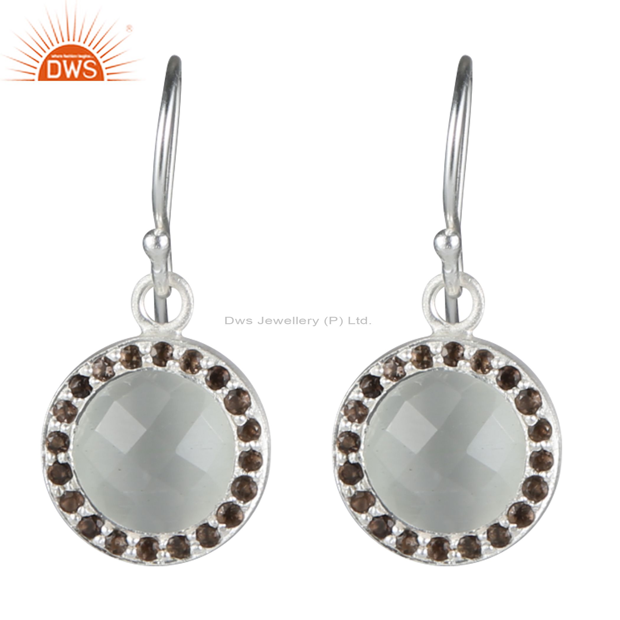 925 Sterling Silver White Moonstone And Smoky Quartz Halo Style Dangle Earrings