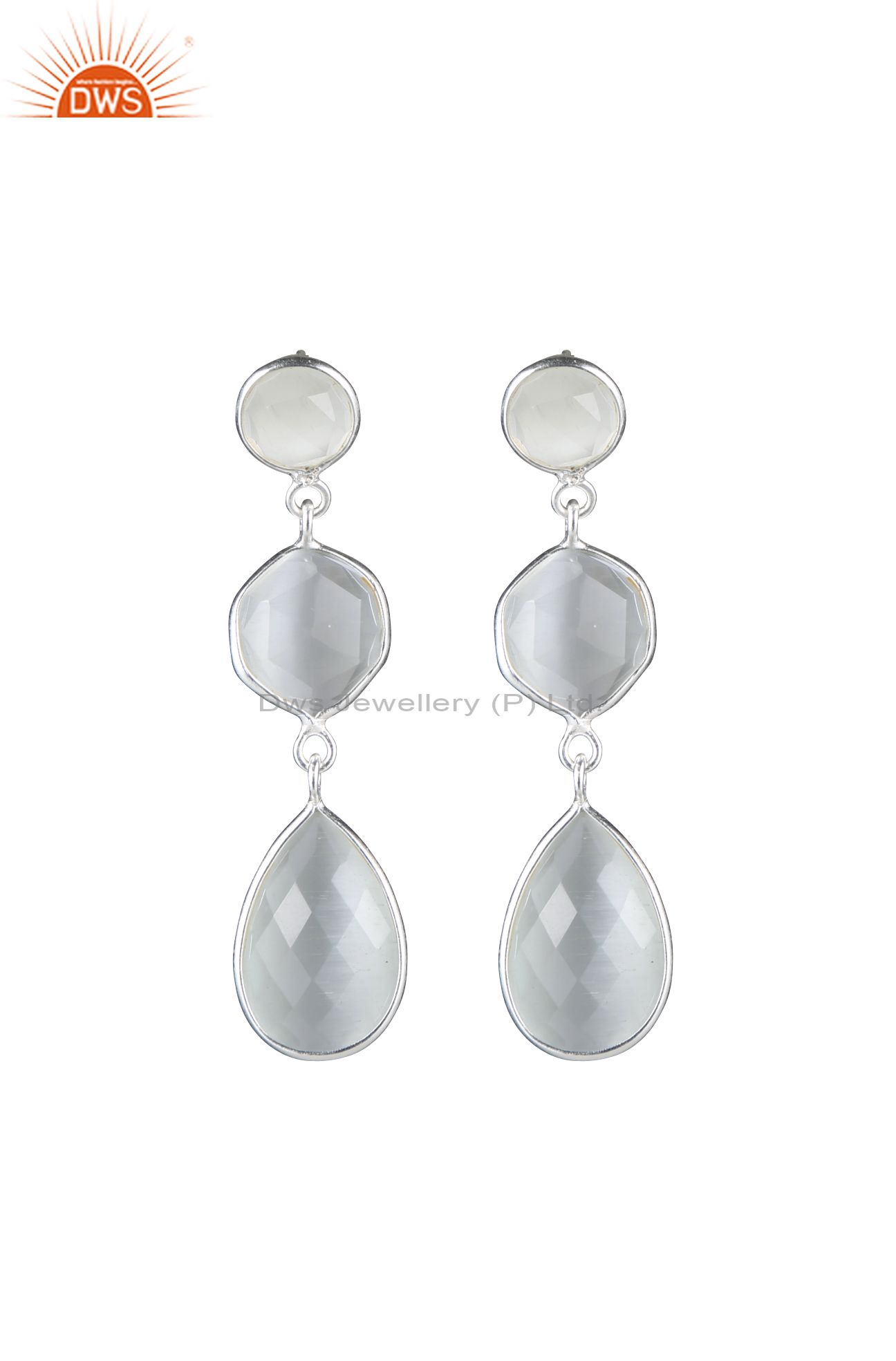 925 Sterling Silver White Moonstone Bezel Set Triple Gemstone Dangle Earrings