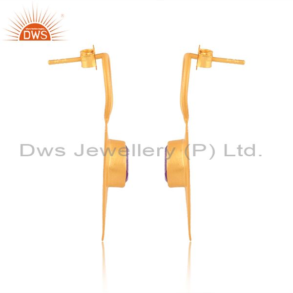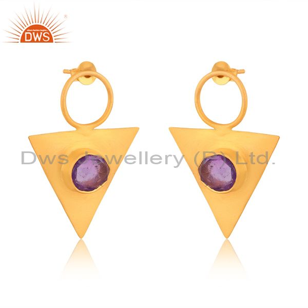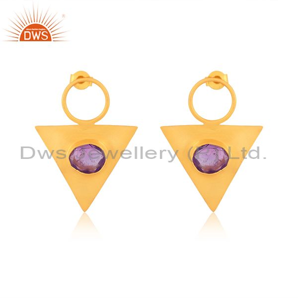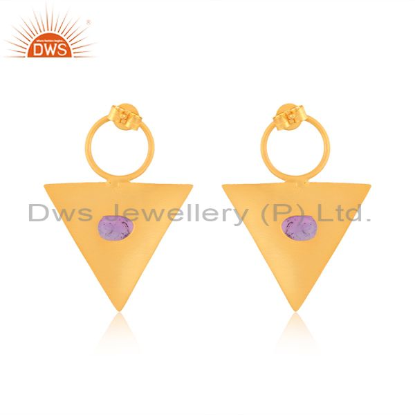 Amethyst Set Gold On 925 Sterling Silver Triangular Earrings