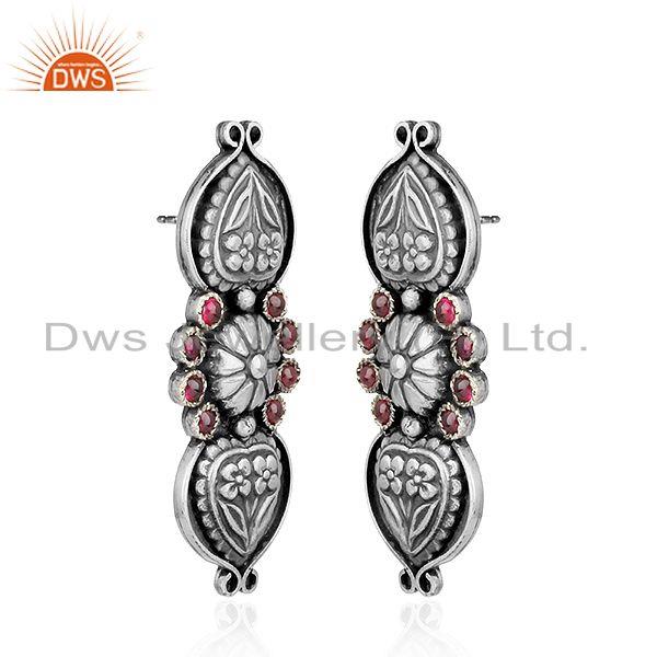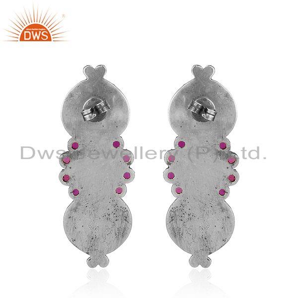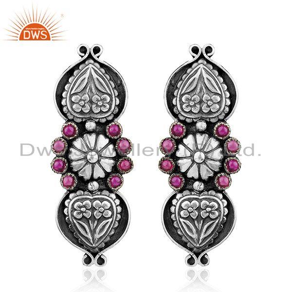 Antique Oxidized Hydro Pink Gemstone Floral Design Silver Earrings