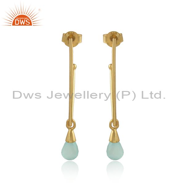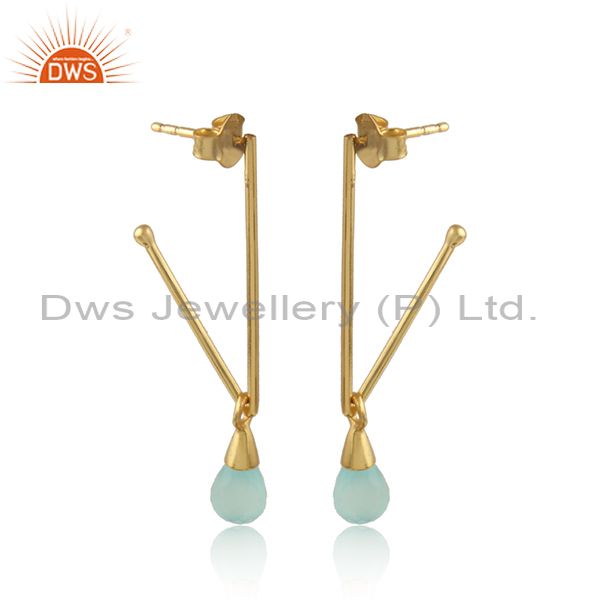 Aqua Chalcedony Gemstone Designer Gold Plated Silver Earrings