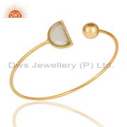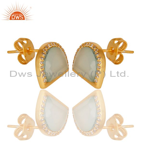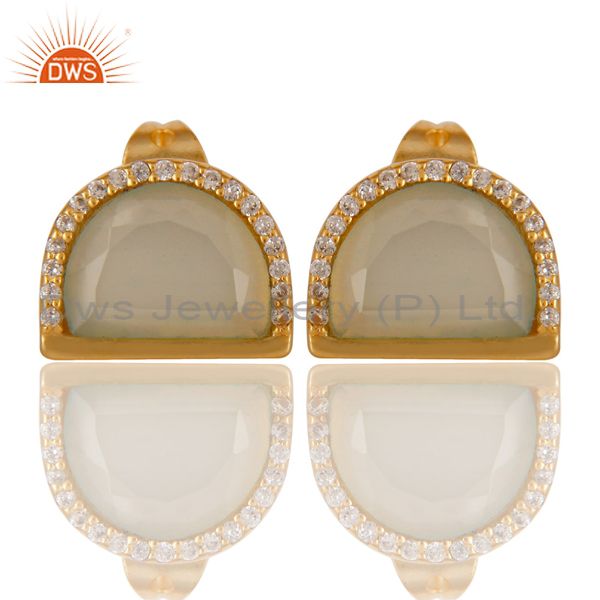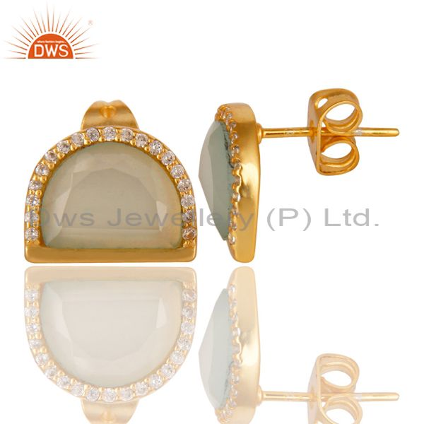 Aqua Chalcedony Half Moon Cz Stud Gold Plated 92.5 Sterling Silver Earring