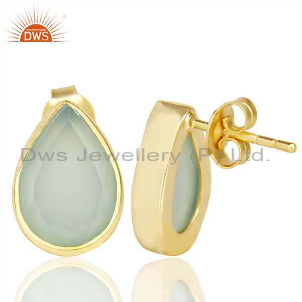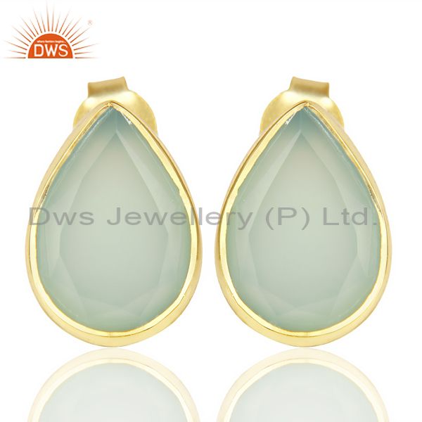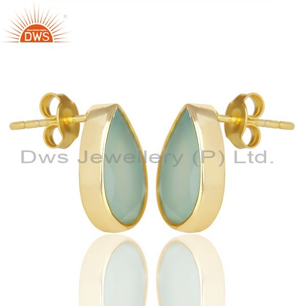 Aqua Chalcedony Pear Shape Flat Back Stud 14K Gold Plated 92.5 Silver Earring