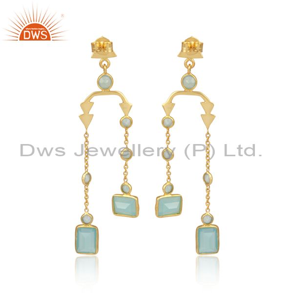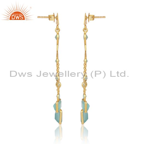 Aqua Chalcedony Set Gold On Silver Long Bell Shape Earrings