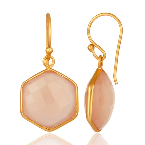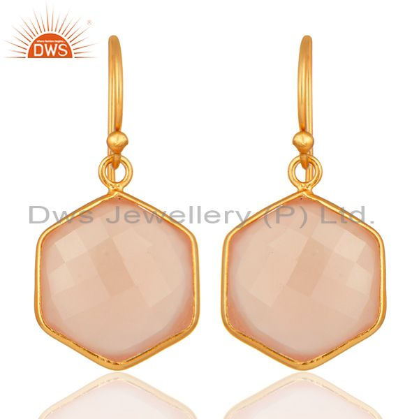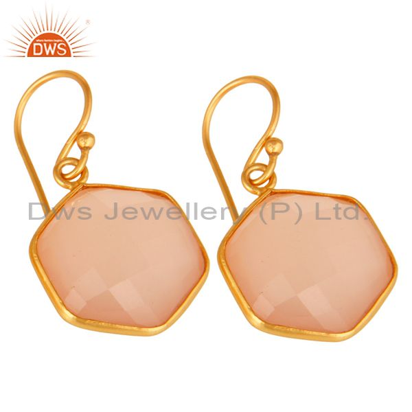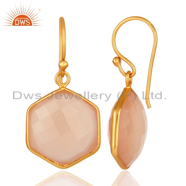 Bezel Set Rose Chalcedony Dangle Earrings In 18K Yellow Gold On Sterling Silver