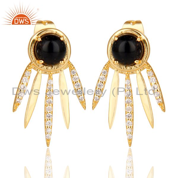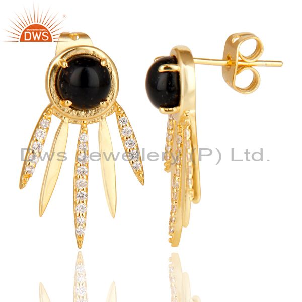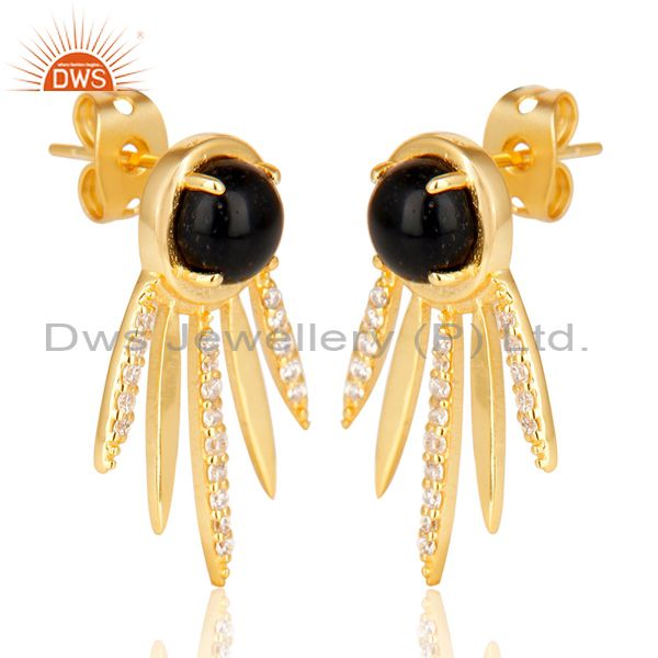 Black Onyx And White Cz Studded Spike Post Gold Plated Sterling Silver Earring