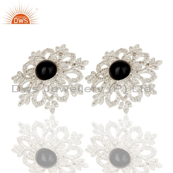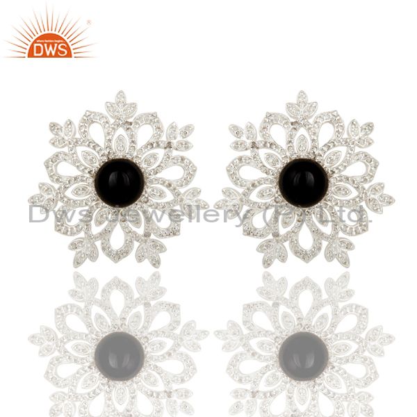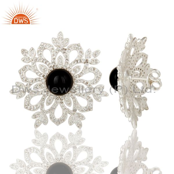 Black Onyx and White Topaz Sterling Silver Flower Designer Stud Earring