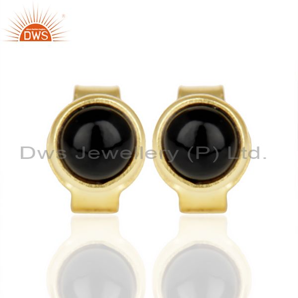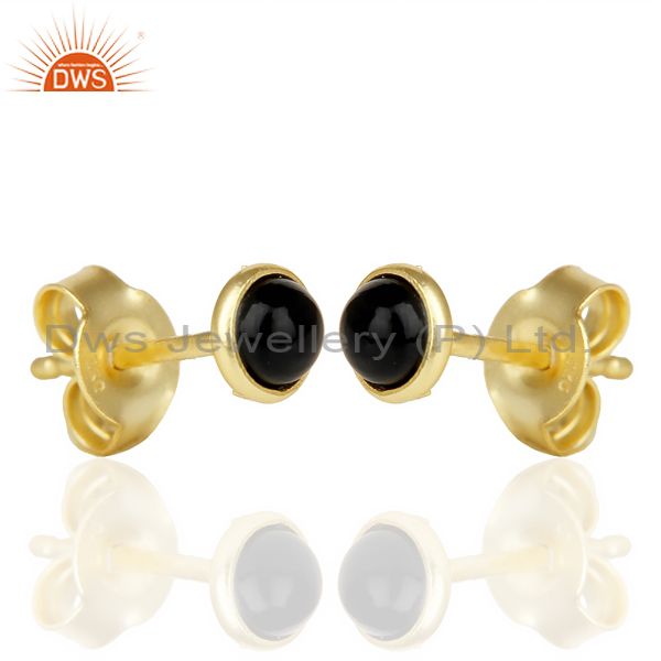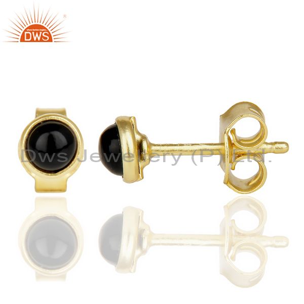 Black Onyx Cabochon Tiny 4Mm Round Stud 14 K Gold Plated Earring