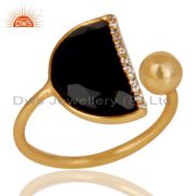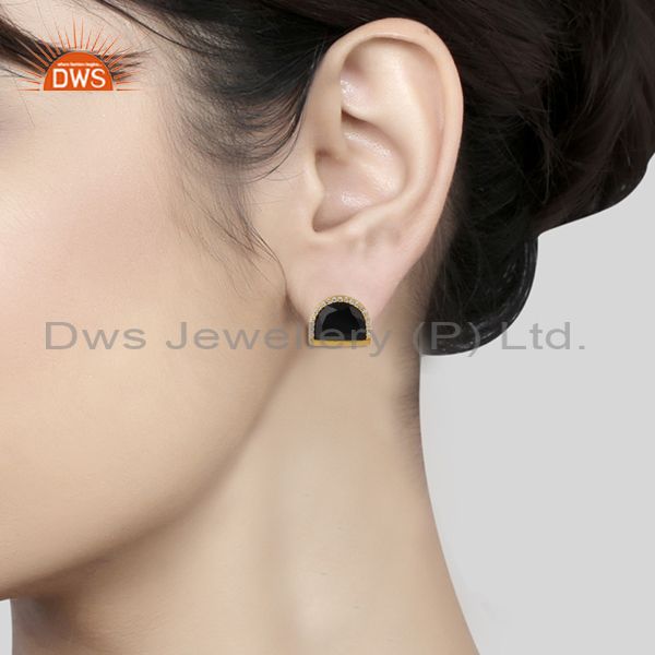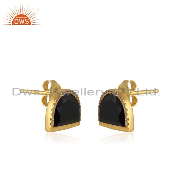 Black Onyx Half Moon Cz Stud Gold Plated 92.5 Sterling Silver Earring
