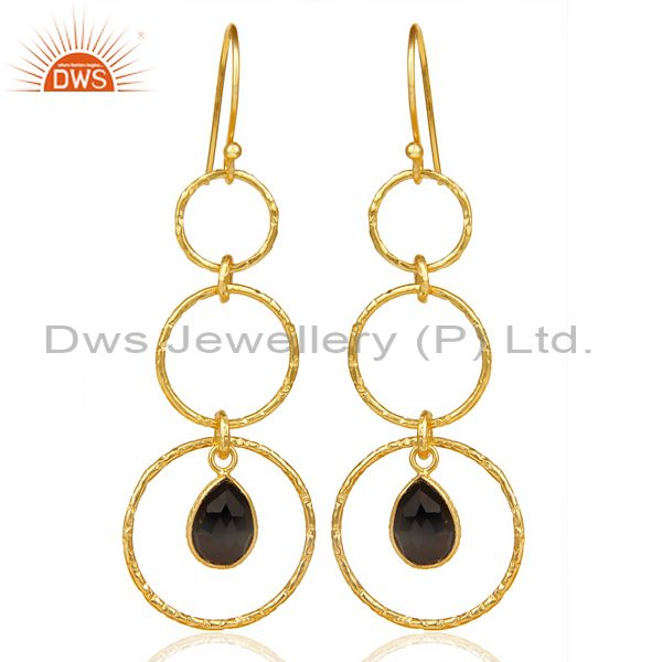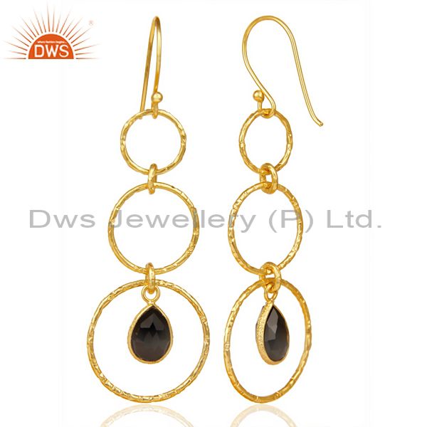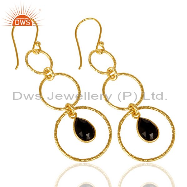 Black Onyx Hammered Circle Dangle 14K Gold Plated 92.5 Sterling Silver Earring