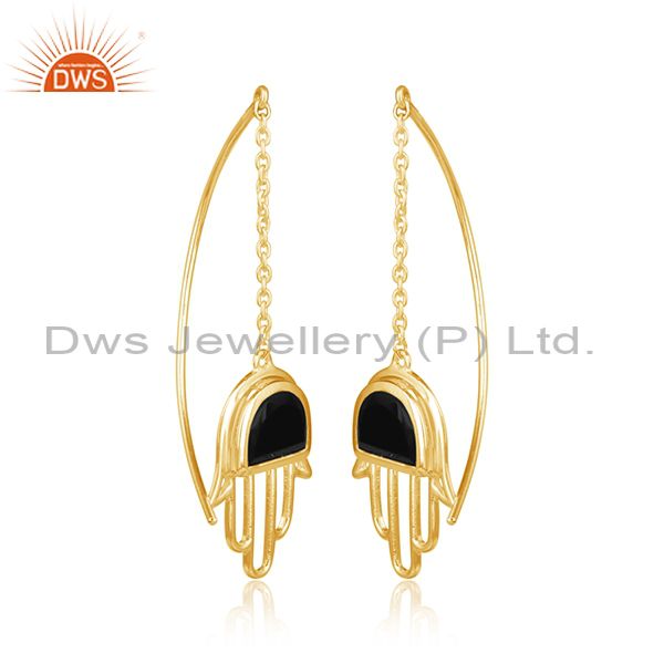 Black Onyx Moon Hamsa Silver Gold Plated Long Earrings