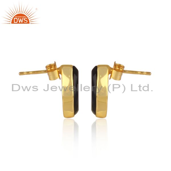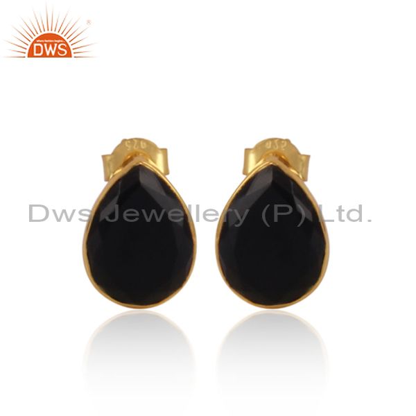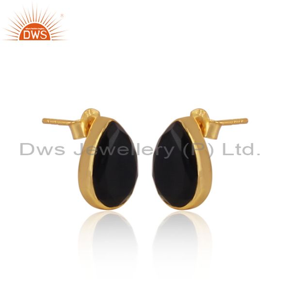 Black Onyx Pear Shape Flat Back Gold Plated Stud Earring In Solid Silver