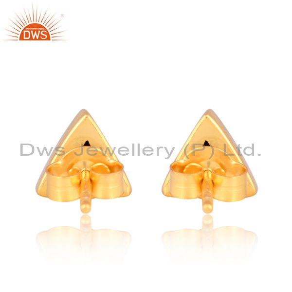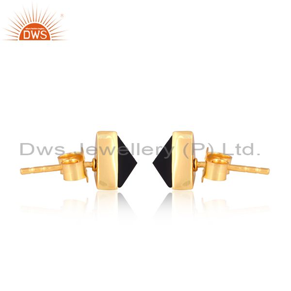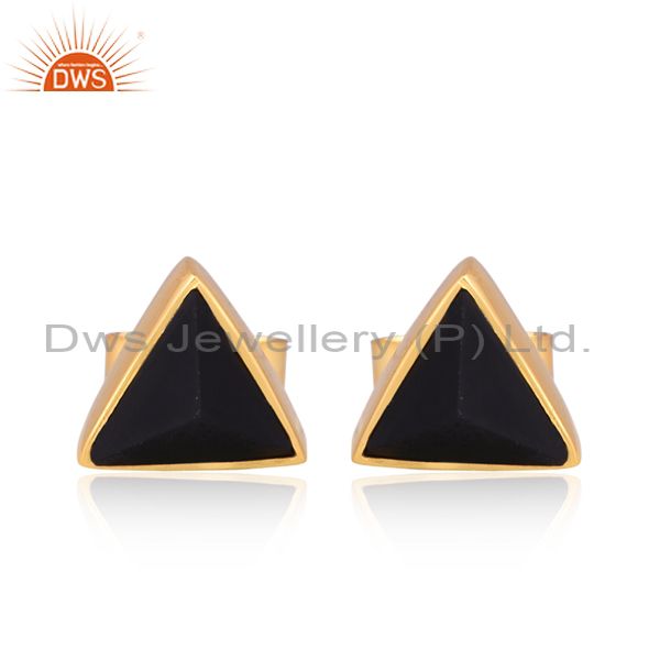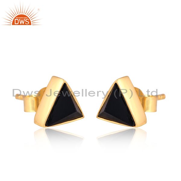 Black Onyx Pyramid Set Gold On Silver Triangular Earrings