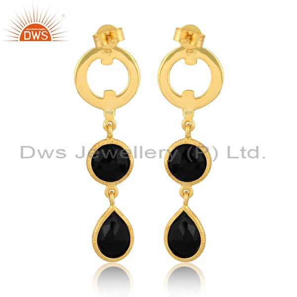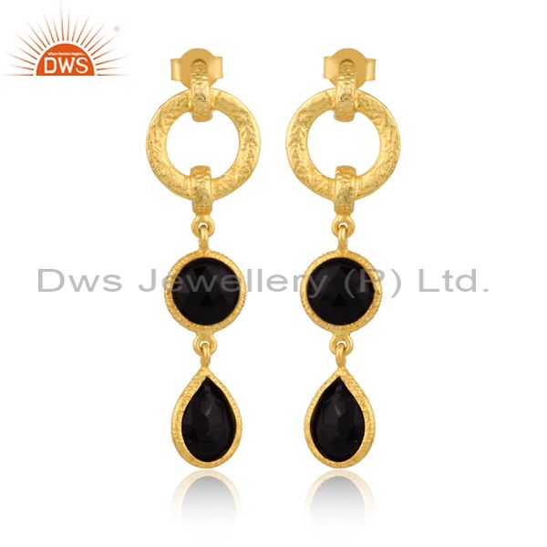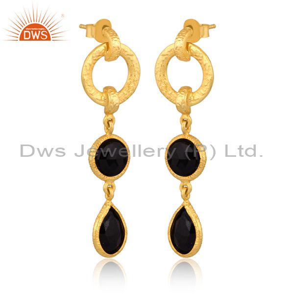 Black Onyx Set Gold On 925 Silver Handmade Textured Earrings