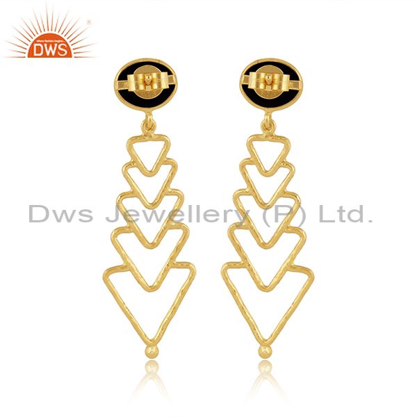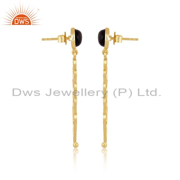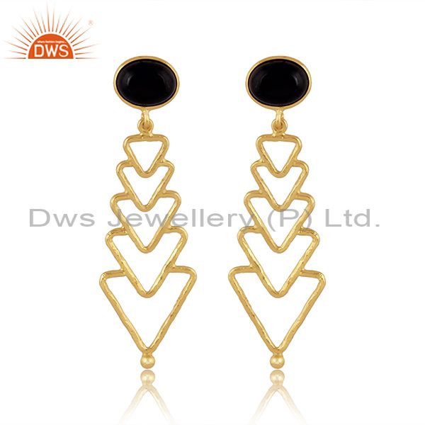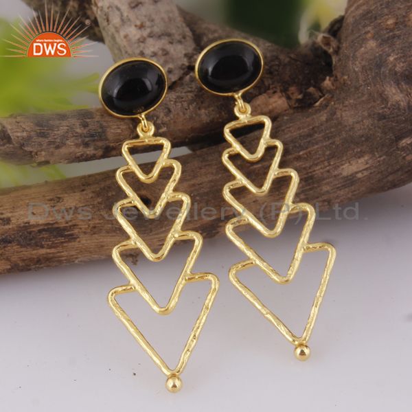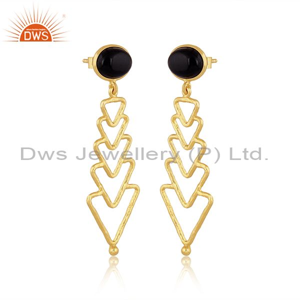 Black Onyx Set Gold On Silver Long Drop Abstract Earrings