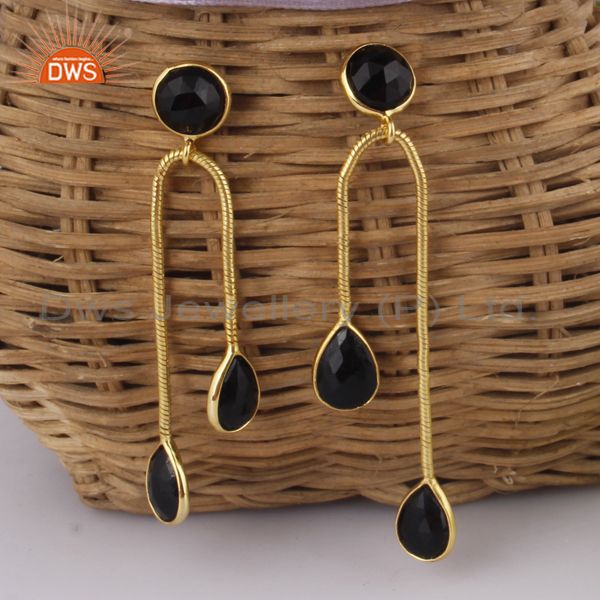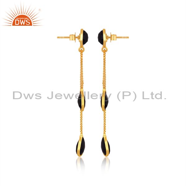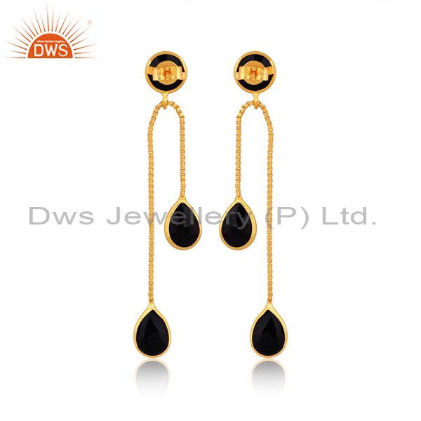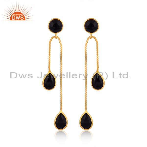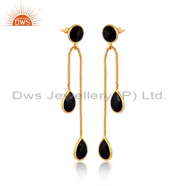 Black Onyx Set Gold On Silver Long Drop Designer Earrings