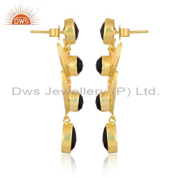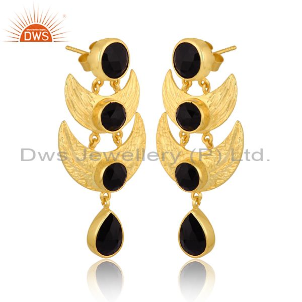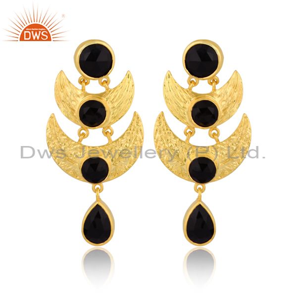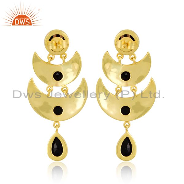 Black Onyx Set Gold On Silver Moon Shaped Long Drop Earrings