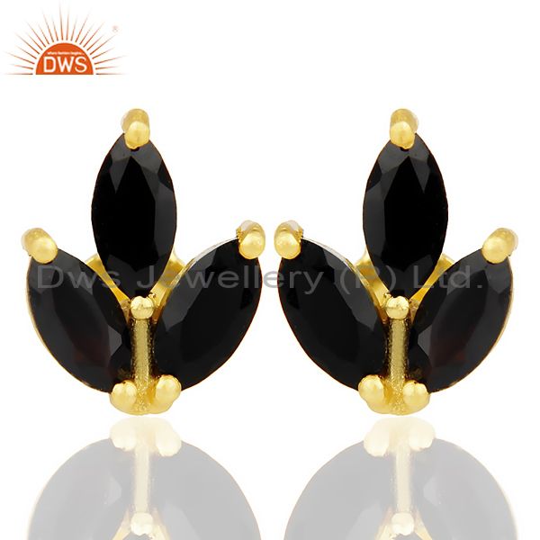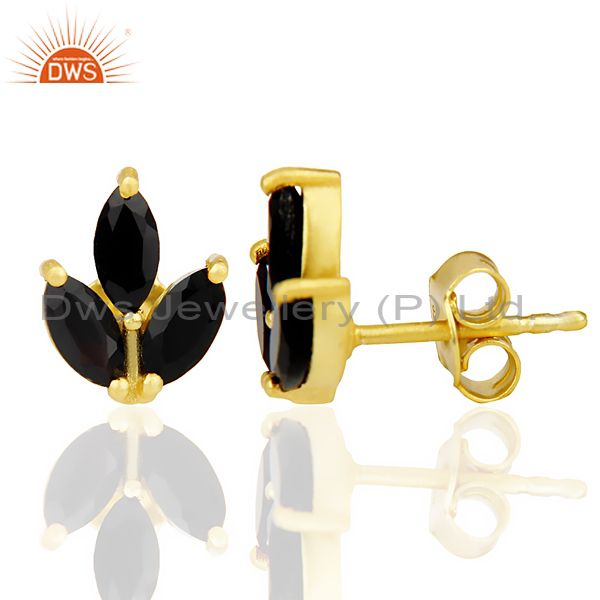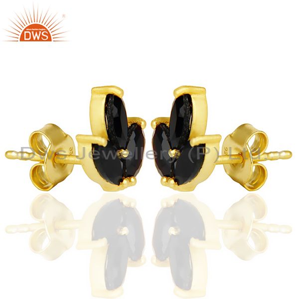 Black Onyx Tiny Flower Stud Earring In 14 K Gold Plated Sterling Silver