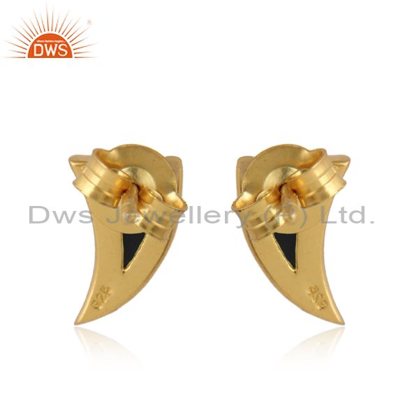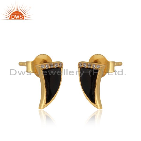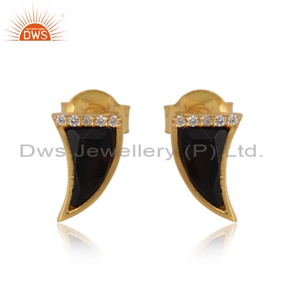 Black Onyx Tiny Horn Cz Studded Post Gold Plated Sterling Silver Earring