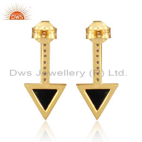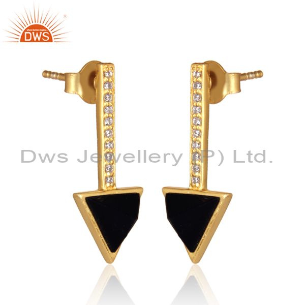Black Onyx Triangle Post 14K Gold Plated 92.5 Sterling Silver Earring