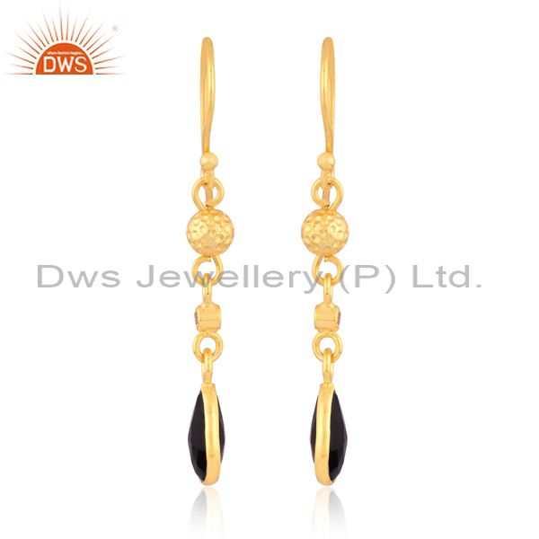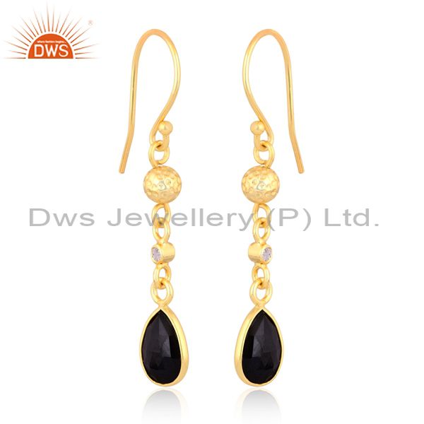 Black Onyx White Topaz Dangle Filigree 14K Gold 92.5 Sterling Silver Earring
