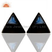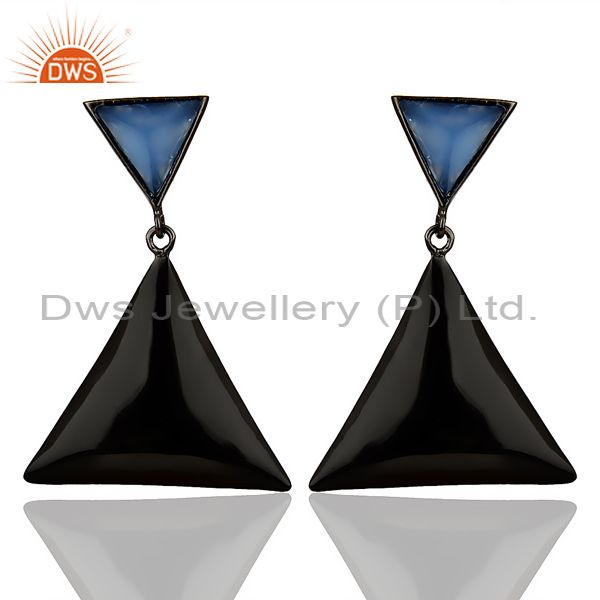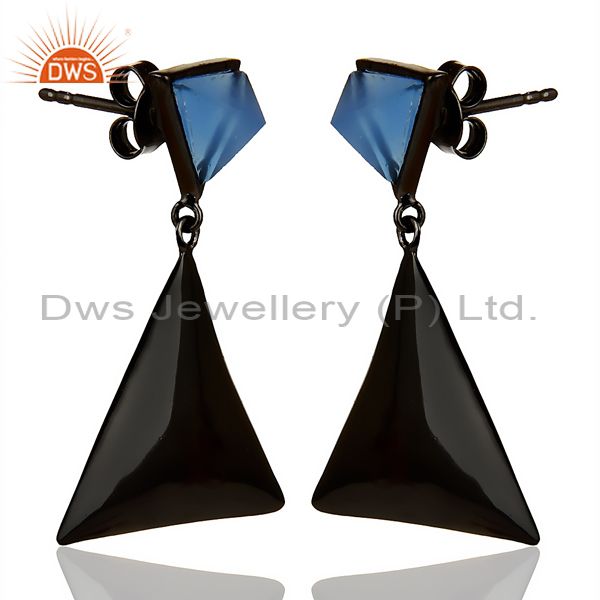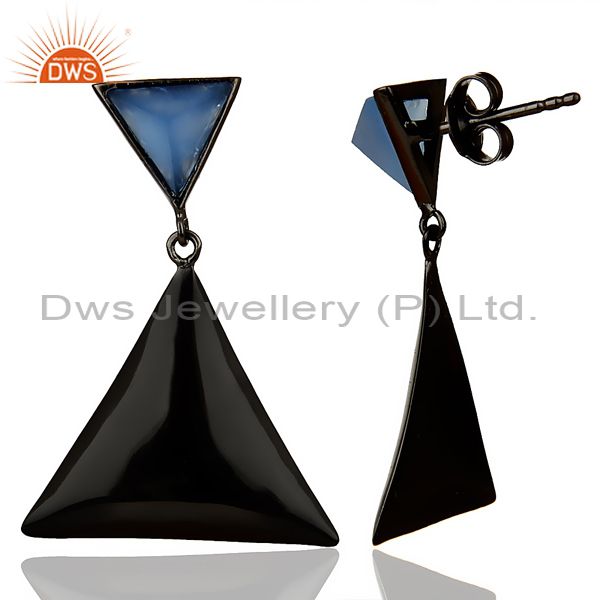 Black Oxidized 925 Silver Handmade Pyramid Design Blue Chalcedony Drops Earrings