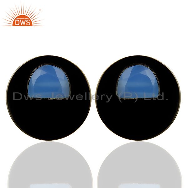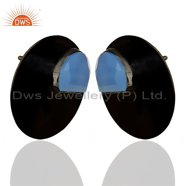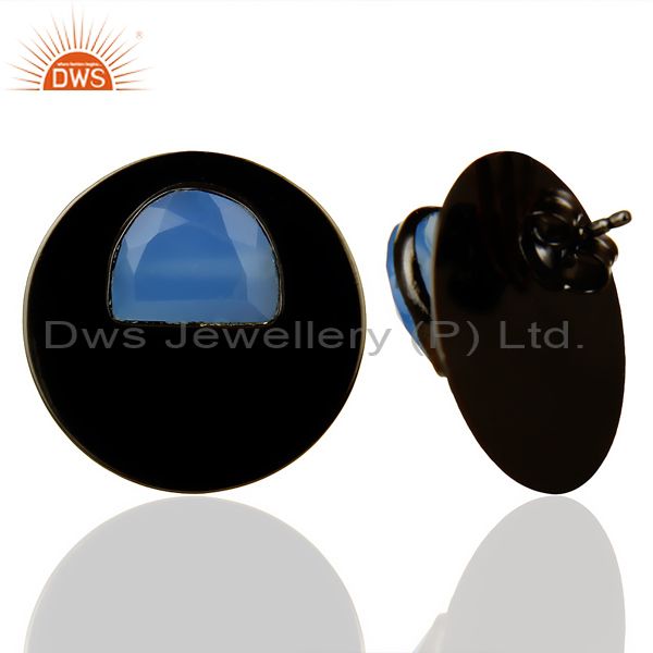 Black Oxidized 925 Silver Round Design Aqua Blue Chalcedony Stud Earrings