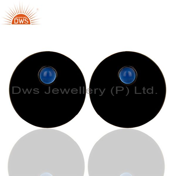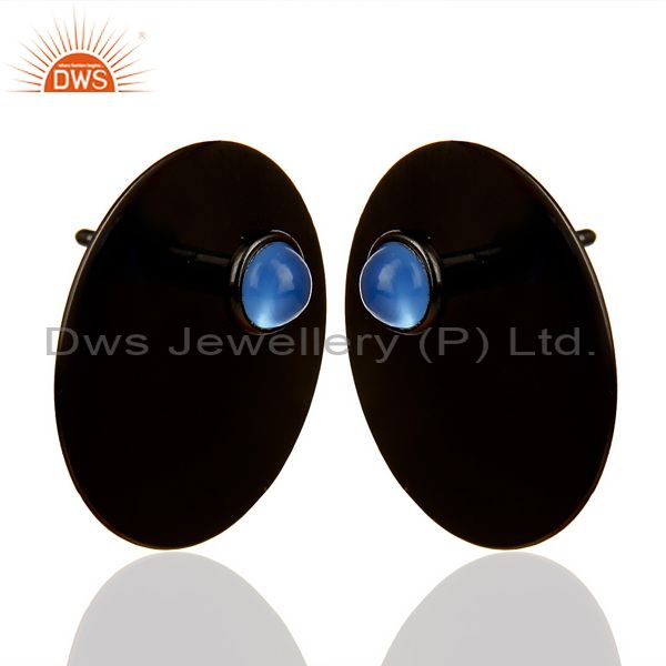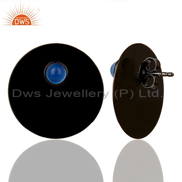 Black Oxidized 925 Silver Round Design Dyed Blue Chalcedony Studs Earrings